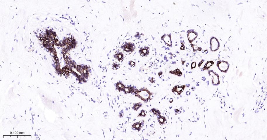Paraformaldehyde-fixed, paraffin embedded Human breast; Antigen retrieval by boiling in sodium citrate buffer (pH6.0) for 15 min; Antibody incubation with CK7 Monoclonal Antibody, Unconjugated(bsm-52065R) at 1:200 overnight at 4°C, followed by conjugation to the bs-0295G-HRP and DAB (C-0010) staining.