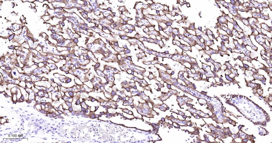 Paraformaldehyde-fixed, paraffin embedded Mouse placenta; Antigen retrieval by boiling in sodium citrate buffer (pH6.0) for 15 min; Antibody incubation with CK7 Monoclonal Antibody, Unconjugated(bsm-52065R) at 1:200 overnight at 4°C, followed by conjugation to the bs-0295G-HRP and DAB (C-0010) staining.