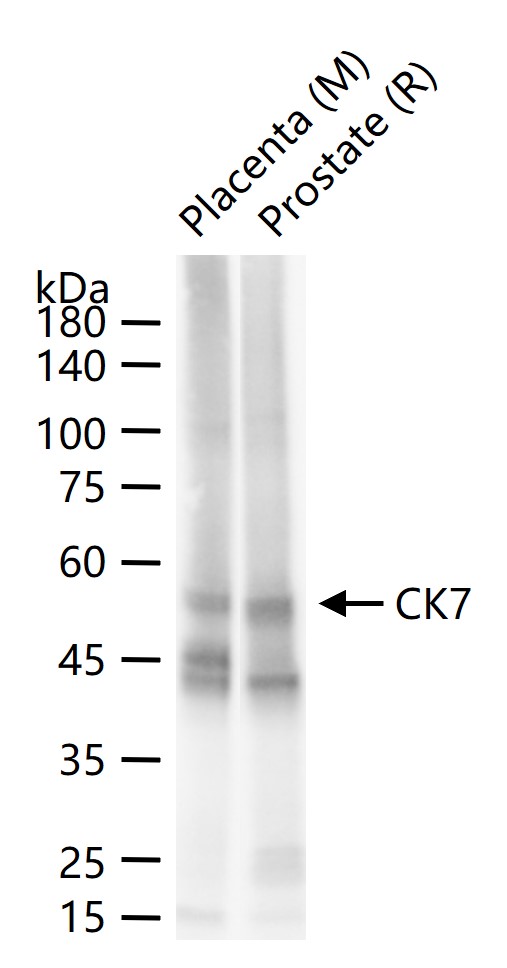 25 ug total protein per lane of various lysates (see on figure) probed with CK7 monoclonal antibody, unconjugated (bsm-52065R) at 1:1000 dilution and 4°C overnight incubation. Followed by conjugated secondary antibody incubation at r.t. for 60 min.