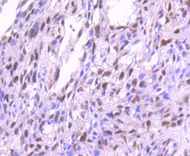 Paraformaldehyde-fixed, paraffin embedded (human breast carcinoma); Antigen retrieval by boiling in sodium citrate buffer (pH6.0) for 15min; Block endogenous peroxidase by 3% hydrogen peroxide for 20 minutes; Blocking buffer (normal goat serum) at 37°C for 30min; Antibody incubation with (Phospho-PKC alpha (Thr638)) Monoclonal Antibody, Unconjugated (bsm-52187R) at 1:50 overnight at 4°C, followed by operating according to SP Kit(Rabbit) (sp-0023) instructionsand DAB staining.