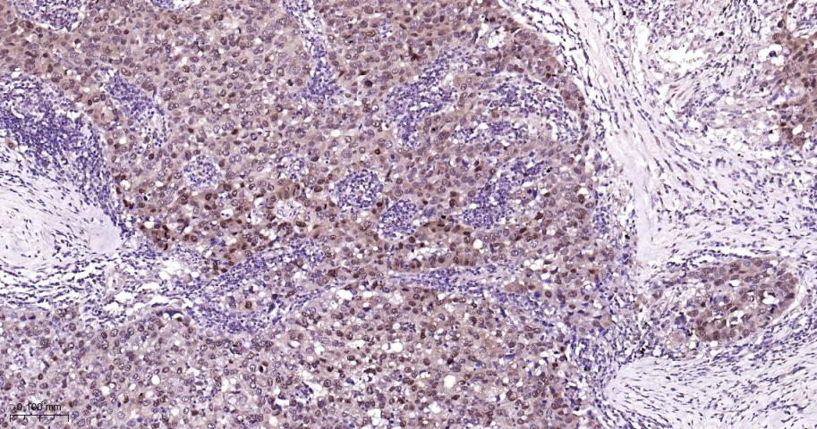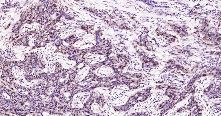 Paraformaldehyde-fixed, paraffin embedded Human lung squamous cell carcinoma; Antigen retrieval by boiling in sodium citrate buffer (pH6.0) for 15 min; Antibody incubation with HSP70 Monoclonal Antibody, Unconjugated(bsm-52241R) at 1:200 overnight at 4°C, followed by conjugation to the bs-0295G-HRP and DAB (C-0010) staining.
