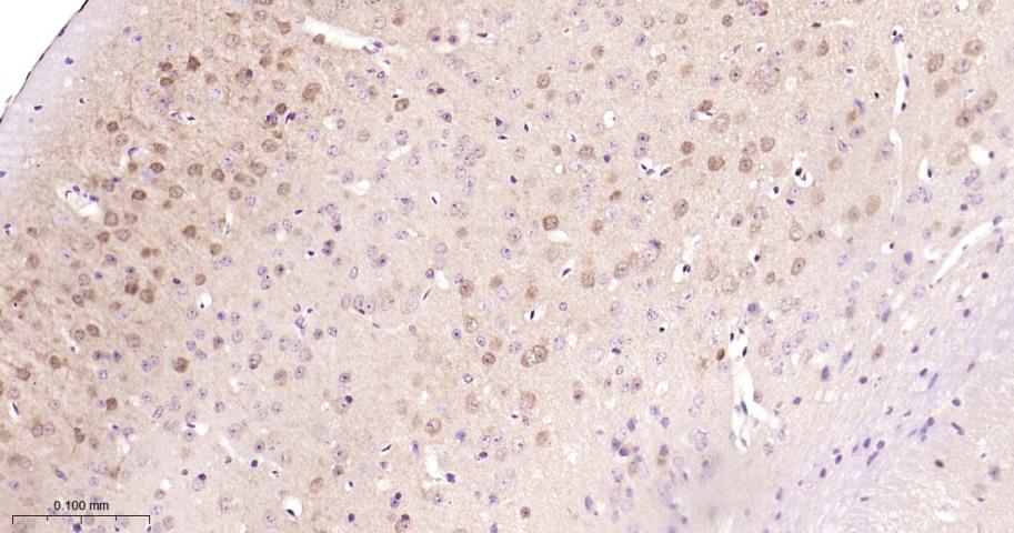 Paraformaldehyde-fixed, paraffin embedded Mouse Cerebrum; Antigen retrieval by boiling in sodium citrate buffer (pH6.0) for 15 min; Antibody incubation with HSP70 Monoclonal Antibody, Unconjugated(bsm-52241R) at 1:200 overnight at 4°C, followed by conjugation to the bs-0295G-HRP and DAB (C-0010) staining.