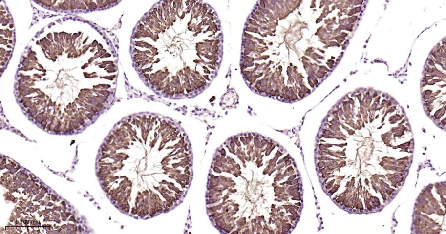 Paraformaldehyde-fixed, paraffin embedded Rat Testicles; Antigen retrieval by boiling in sodium citrate buffer (pH6.0) for 15 min; Antibody incubation with HSP70 Monoclonal Antibody, Unconjugated(bsm-52241R) at 1:200 overnight at 4°C, followed by conjugation to the bs-0295G-HRP and DAB (C-0010) staining.