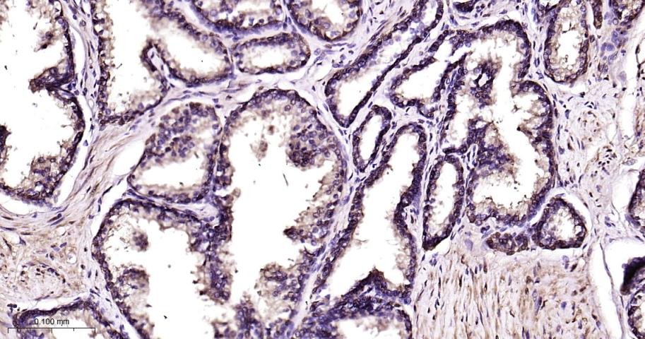 Paraformaldehyde-fixed, paraffin embedded Human Prostate Cancer; Antigen retrieval by boiling in sodium citrate buffer (pH6.0) for 15 min; Antibody incubation with HSP70 Monoclonal Antibody, Unconjugated(bsm-52241R) at 1:200 overnight at 4°C, followed by conjugation to the bs-0295G-HRP and DAB (C-0010) staining.