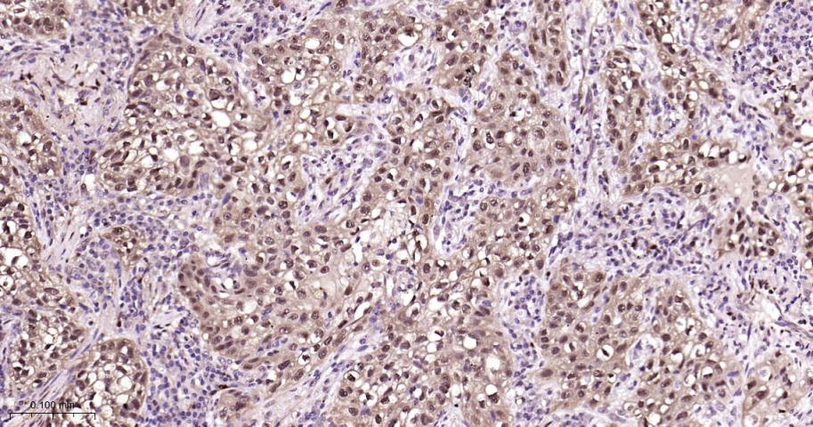 Paraformaldehyde-fixed, paraffin embedded Human Cervical Cancer; Antigen retrieval by boiling in sodium citrate buffer (pH6.0) for 15 min; Antibody incubation with HSP70 Monoclonal Antibody, Unconjugated(bsm-52241R) at 1:200 overnight at 4°C, followed by conjugation to the bs-0295G-HRP and DAB (C-0010) staining.