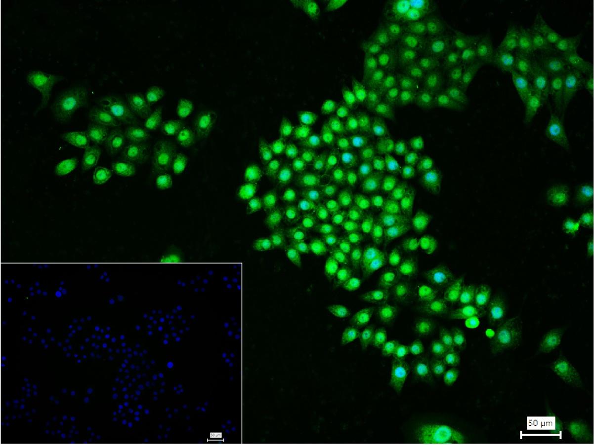 4% Paraformaldehyde-fixed MCF-7 (H) cell; Triton X-100 at r.t. for 20 min; Antibody incubation with (HSP70) monoclonal Antibody, unconjugated (bsm-52241R) 1:100, 90 min at 37°C; followed by conjugated Goat Anti-Rabbit IgG antibody (green, bs-40295G-FITC) at 37°C for 90 min, DAPI (blue, C02-04002) was used to stain the cell nuclei. PBS instead of the primary antibody was used as the blank control.