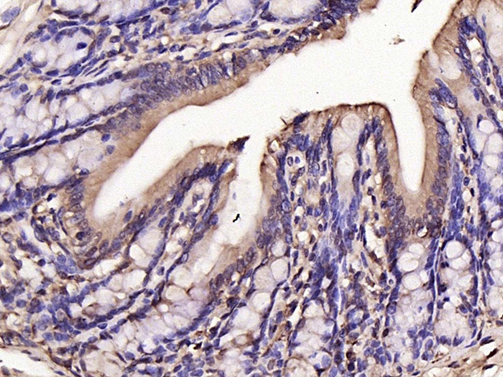 Paraformaldehyde-fixed, paraffin embedded (rat colon); Antigen retrieval by boiling in sodium citrate buffer (pH6.0) for 15min; Block endogenous peroxidase by 3% hydrogen peroxide for 20 minutes; Blocking buffer (normal goat serum) at 37°C for 30min; Antibody incubation with (iNOS) Polyclonal Antibody, Unconjugated (bs-22924R ) at 1:200 overnight at 4°C, followed by operating according to SP Kit(Rabbit) (sp-0023) instructionsand DAB staining.