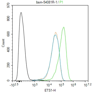 The Jurkat (H) cells were fixed with 4% PFA (10 min at r.t.) and then permeabilized with 90% ice-cold methanol for 20 min at -20℃,the cells then were incubated in 5%BSA to block non-specific protein-protein interactions (30 min at r.t.).Primary Antibody (green):Rabbit Anti-ETS1 antibody (bsm-54081R): 1 μg/10^6 cells; Secondary Antibody (white blue): Goat anti-Rabbit IgG-FITC (bs-60295G-FITC): 1 μg/test. Isotype Control (orange): Rabbit IgG (bs-0295P). Blank control (black): PBS. Acquisition of 20,000 events was performed.