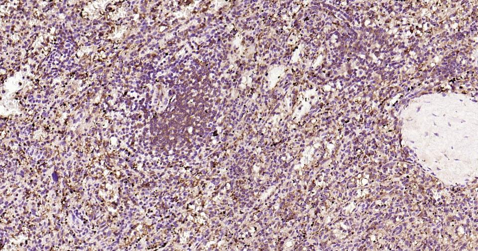 Paraformaldehyde-fixed, paraffin embedded Human Spleen; Antigen retrieval by boiling in sodium citrate buffer (pH6.0) for 15 min; Antibody incubation withIL-4? Monoclonal Antibody, Unconjugated(bsm-54002R) at 1:200 overnight at 4°C, followed by conjugation to the bs-0295G-HRP and DAB (C-0010) staining.