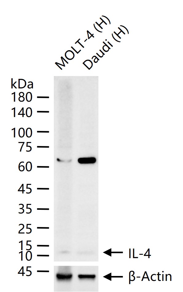 25 ug total protein per lane of various lysates (see on figure) probed with IL-4 monoclonal antibody, unconjugated (bsm-54002R) at 1:1000 dilution and 4°C overnight incubation. Followed by conjugated secondary antibody incubation at r.t. for 60 min.