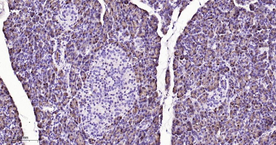 Paraformaldehyde-fixed, paraffin embedded Human Pancreas; Antigen retrieval by boiling in sodium citrate buffer (pH6.0) for 15 min; The section was incubated with SPINK1 Monoclonal Antibody, Unconjugated (bsm-60323R) at 1:200 overnight at 4°C, followed by conjugation to the bs-0295G-HRP and DAB (C-0010) staining.