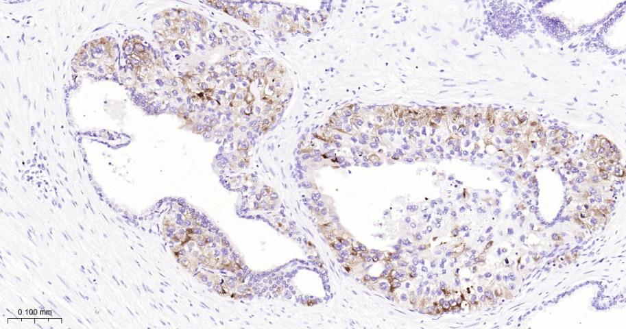 Paraformaldehyde-fixed, paraffin embedded Human Prostate Cancer; Antigen retrieval by boiling in sodium citrate buffer (pH6.0) for 15 min; The section was incubated with SPINK1 Monoclonal Antibody, Unconjugated (bsm-60323R) at 1:200 overnight at 4°C, followed by conjugation to the bs-0295G-HRP and DAB (C-0010) staining.