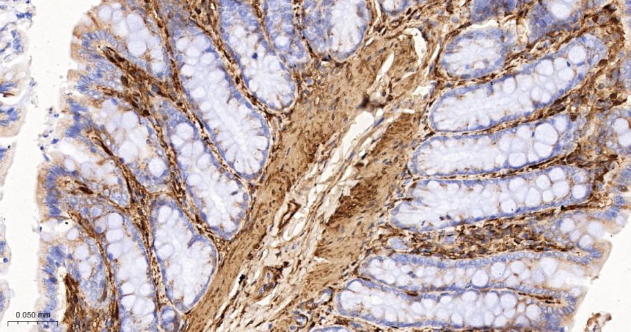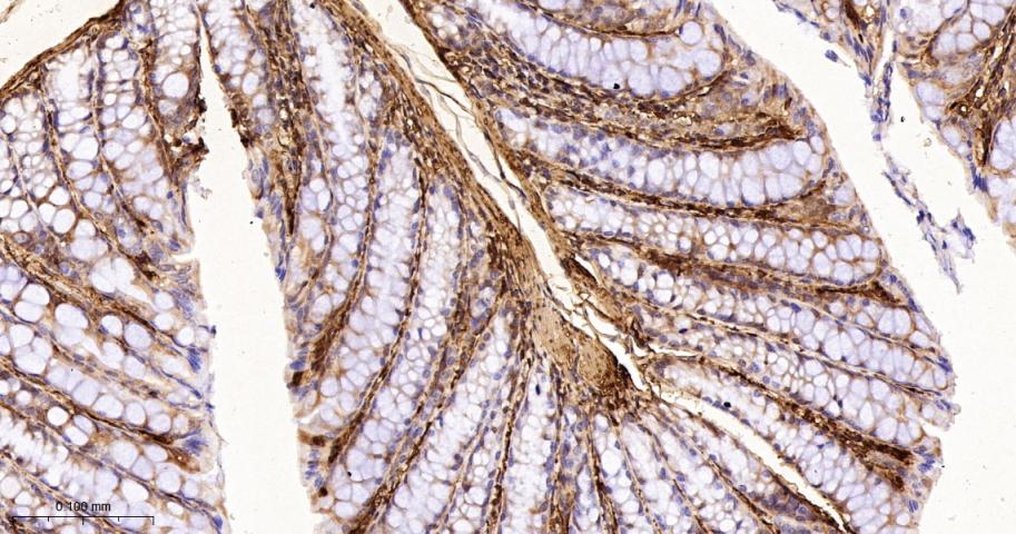Paraformaldehyde-fixed, paraffin embedded Mouse Colon; Antigen retrieval by boiling in sodium citrate buffer (pH6.0) for 15 min; The section was incubated with Galectin-1 Monoclonal Antibody, Unconjugated (bsm-60296R) at 1:200 overnight at 4°C, followed by conjugation to the bs-0295G-HRP and DAB (C-0010) staining.
