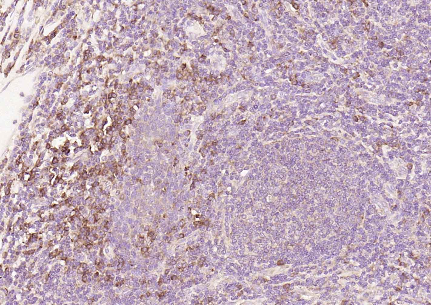 Paraformaldehyde-fixed, paraffin embedded (human lymphoid); Antigen retrieval by boiling in E sodium citrate buffer (pH6.0) for 15min; Block endogenous peroxidase by 3% hydrogen peroxide for 20 minutes; Blocking buffer (normal goat serum) at 37°C for 30min; Incubation with (CD25) Monoclonal Antibody, Unconjugated (bsm-60613R) at 1:50 overnight at 4°C, followed by operating according to SP Kit(Rabbit) (sp-0023) instructionsand DAB staining.