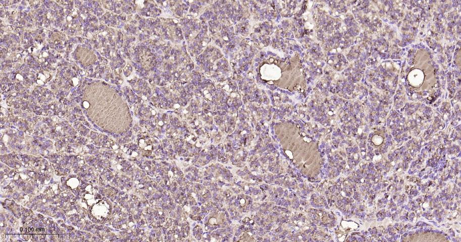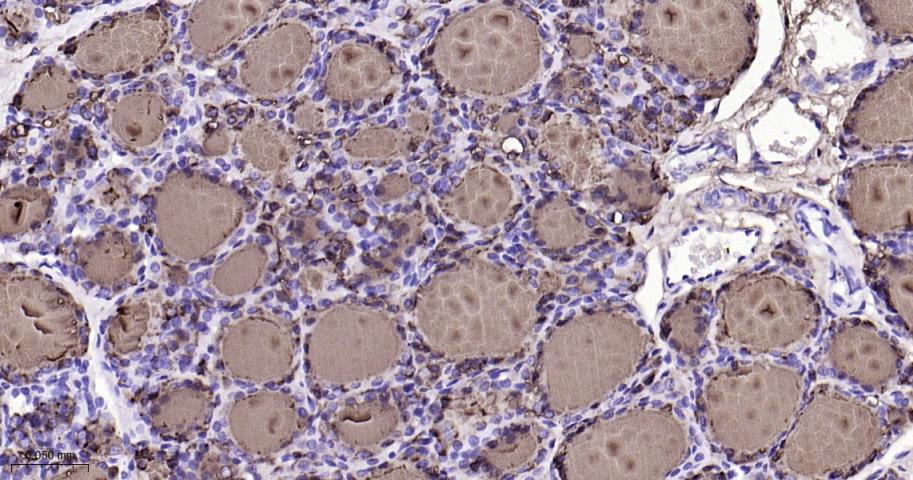 Paraformaldehyde-fixed, paraffin embedded Mouse Thyroid Gland; Antigen retrieval by boiling in sodium citrate buffer (pH6.0) for 15 min; Antibody incubation with TG Monoclonal Antibody, Unconjugated(bsm-60597R) at 1:200 overnight at 4°C, followed by conjugation to the bs-0295G-HRP and DAB (C-0010) staining.