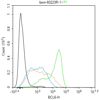 The Daudi (H) cells were fixed with 4% PFA (10 min at r.t.) and then permeabilized with 90% ice-cold methanol for 20 min at -20℃,the cells then were incubated in 5%BSA to block non-specific protein-protein interactions (30 min at r.t.).Primary Antibody (green):Rabbit Anti-BCL6 antibody (bsm-60223R): 1 μg/10^6 cells; Secondary Antibody (white blue): Goat anti-Rabbit IgG-FITC (bs-40295G-FITC): 1 μg/test. Isotype Control (orange): Rabbit IgG (bs-0295P). Blank control (black): PBS. Acquisition of 20,000 events was performed.