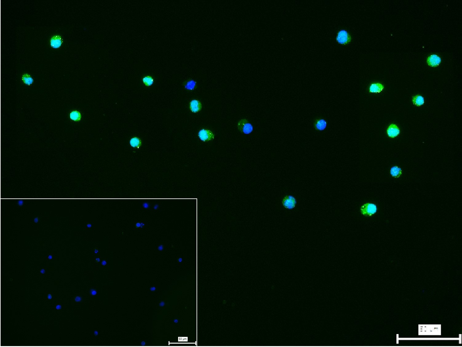 4% Paraformaldehyde-fixed Daudi (H) cell; Triton X-100 at r.t. for 20 min; Antibody incubation with (BCL6) monoclonal Antibody, unconjugated (bsm-60223R) 1:100, 90 min at 37°C; followed by conjugated Goat Anti-Rabbit IgG antibody (green, bs-40295G-FITC) at 37°C for 90 min, DAPI (blue, C02-04002) was used to stain the cell nuclei. PBS instead of the primary antibody was used as the blank control.