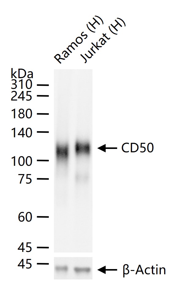 25 ug total protein per lane of various lysates (see on figure) probed with CD50 monoclonal antibody, unconjugated (bsm-60619R) at 1:1000 dilution and 4°C overnight incubation. Followed by conjugated secondary antibody incubation at r.t. for 60 min.