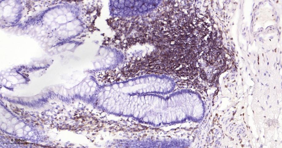 Paraformaldehyde-fixed, paraffin embedded Human Colon; Antigen retrieval by boiling in sodium citrate buffer (pH6.0) for 15 min; The section was incubated with CD50 Monoclonal Antibody, Unconjugated (bsm-60619R) at 1:200 overnight at 4°C, followed by conjugation to the bs-0295G-HRP and DAB (C-0010) staining.