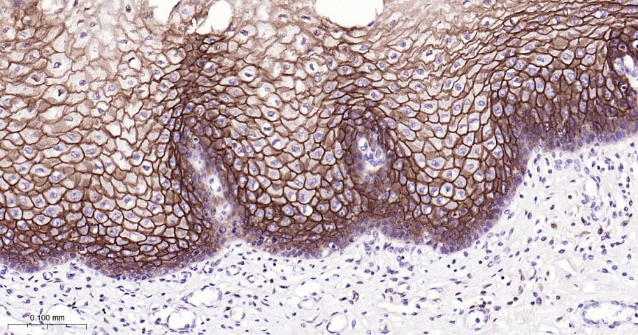 Paraformaldehyde-fixed, paraffin embedded Human Esophagus; Antigen retrieval by boiling in sodium citrate buffer (pH6.0) for 15 min; The section was incubated with TROP2 Monoclonal Antibody, Unconjugated (bsm-60427R) at 1:200 overnight at 4°C, followed by conjugation to the bs-0295G-HRP and DAB (C-0010) staining.