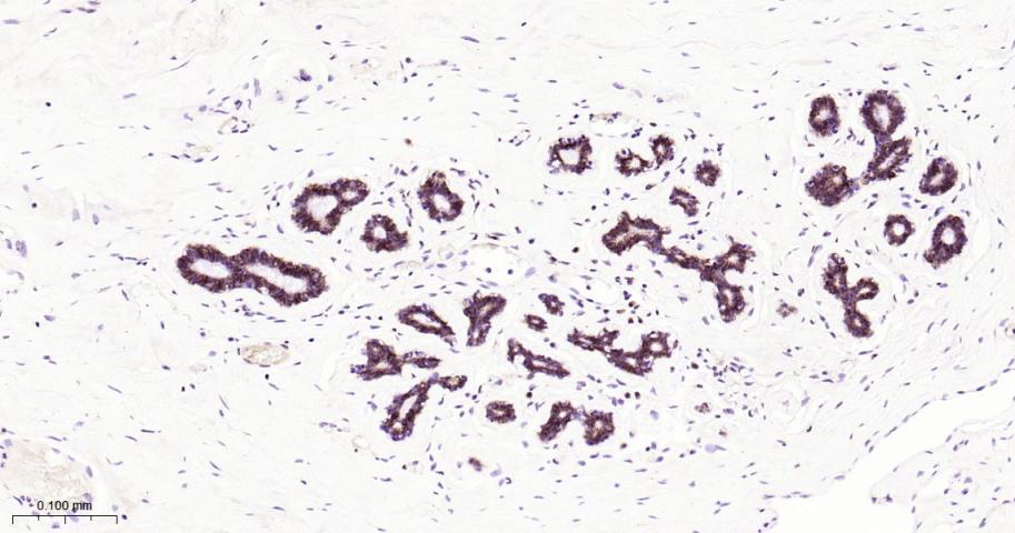 Paraformaldehyde-fixed, paraffin embedded Human Breast; Antigen retrieval by boiling in sodium citrate buffer (pH6.0) for 15 min; The section was incubated with TROP2 Monoclonal Antibody, Unconjugated (bsm-60427R) at 1:200 overnight at 4°C, followed by conjugation to the bs-0295G-HRP and DAB (C-0010) staining.