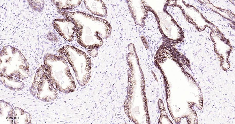 Paraformaldehyde-fixed, paraffin embedded Human Prostate; Antigen retrieval by boiling in sodium citrate buffer (pH6.0) for 15 min; The section was incubated with TROP2 Monoclonal Antibody, Unconjugated (bsm-60427R) at 1:200 overnight at 4°C, followed by conjugation to the bs-0295G-HRP and DAB (C-0010) staining.