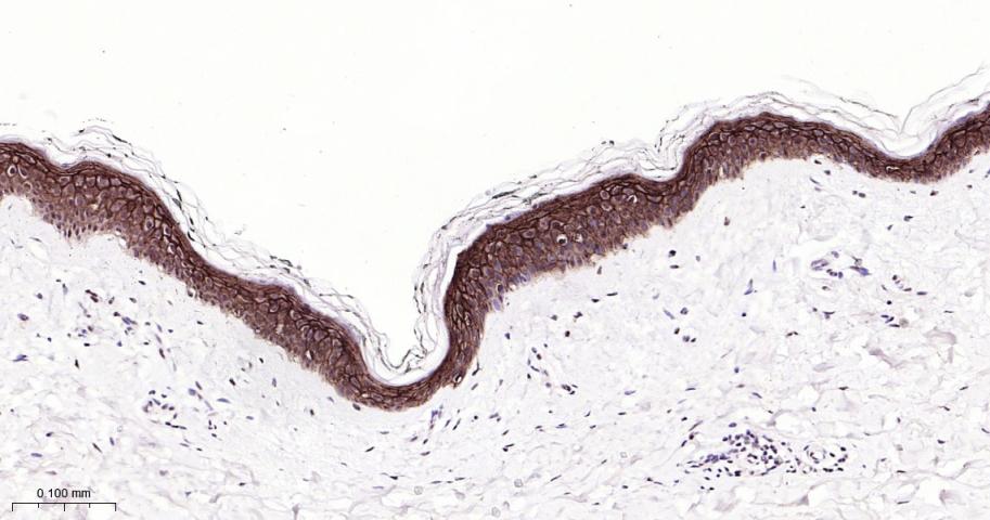Paraformaldehyde-fixed, paraffin embedded Human Abdominal skin; Antigen retrieval by boiling in sodium citrate buffer (pH6.0) for 15 min; The section was incubated with TROP2 Monoclonal Antibody, Unconjugated (bsm-60427R) at 1:200 overnight at 4°C, followed by conjugation to the bs-0295G-HRP and DAB (C-0010) staining.