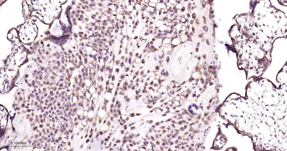 Paraformaldehyde-fixed, paraffin embedded Rat Placenta; Antigen retrieval by boiling in sodium citrate buffer (pH6.0) for 15 min; Antibody incubation with RPS20 Monoclonal Antibody, Unconjugated(bsm-60503R) at 1:200 overnight at 4°C, followed by conjugation to the bs-0295G-HRP and DAB (C-0010) staining.