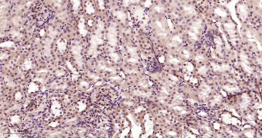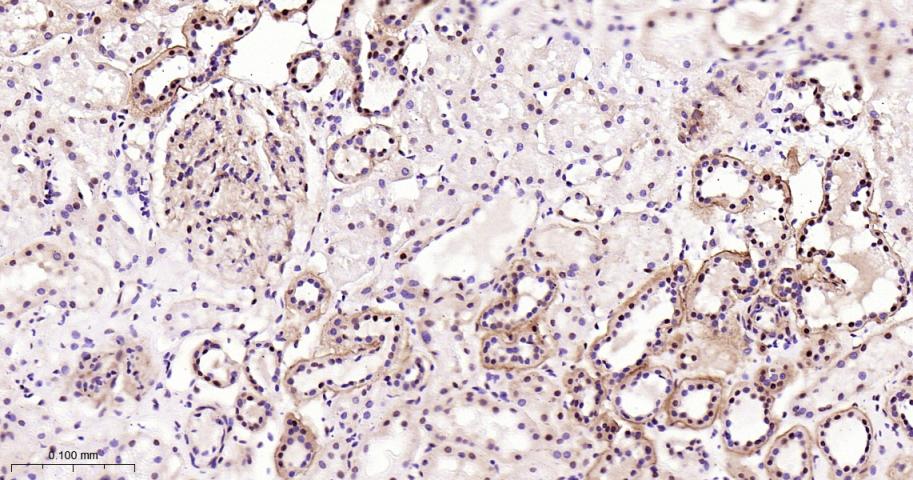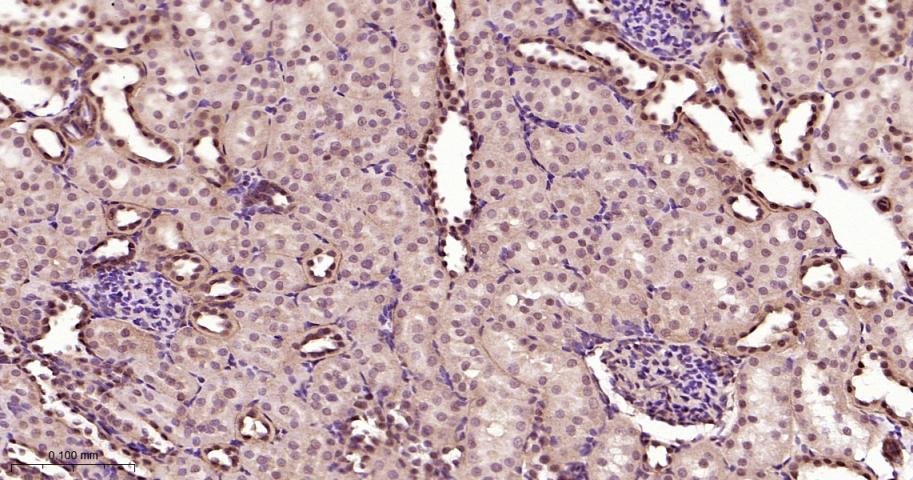 Paraformaldehyde-fixed, paraffin embedded Mouse Kidney; Antigen retrieval by boiling in sodium citrate buffer (pH6.0) for 15 min; The section was incubated with DYNLL1 Monoclonal Antibody, Unconjugated (bsm-60439R) at 1:200 overnight at 4°C, followed by conjugation to the bs-0295G-HRP and DAB (C-0010) staining.