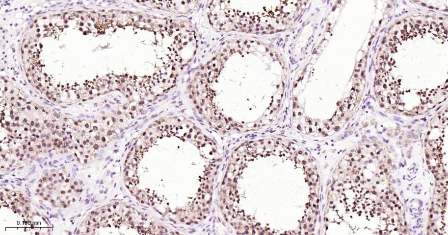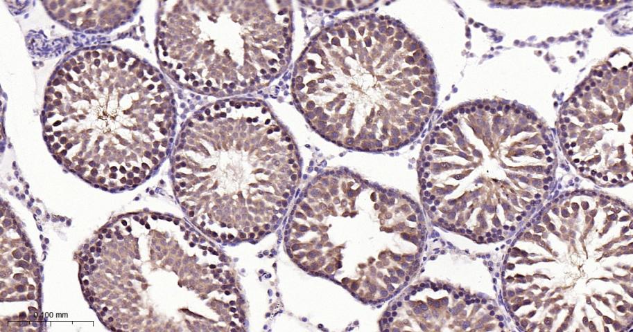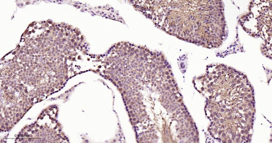 Paraformaldehyde-fixed, paraffin embedded Mouse Testicles; Antigen retrieval by boiling in sodium citrate buffer (pH6.0) for 15 min; The section was incubated with DYNLL1 Monoclonal Antibody, Unconjugated (bsm-60439R) at 1:200 overnight at 4°C, followed by conjugation to the bs-0295G-HRP and DAB (C-0010) staining.