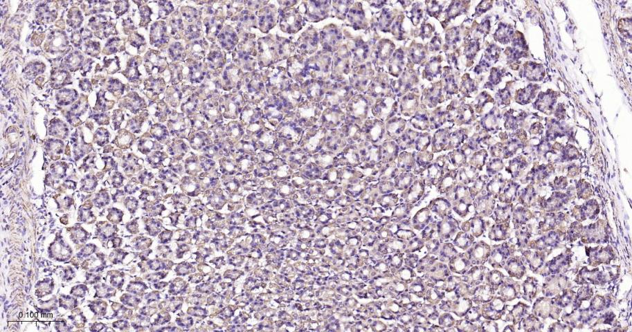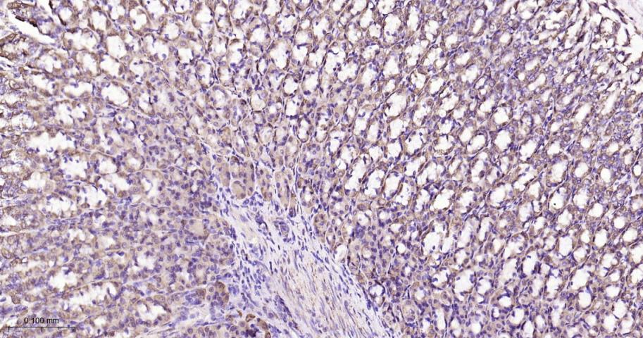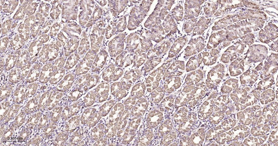 Paraformaldehyde-fixed, paraffin embedded Rat Stomach; Antigen retrieval by boiling in sodium citrate buffer (pH6.0) for 15 min; Antibody incubation with HSPE1 Monoclonal Antibody, Unconjugated(bsm-60471R) at 1:200 overnight at 4°C, followed by conjugation to the bs-0295G-HRP and DAB (C-0010) staining.