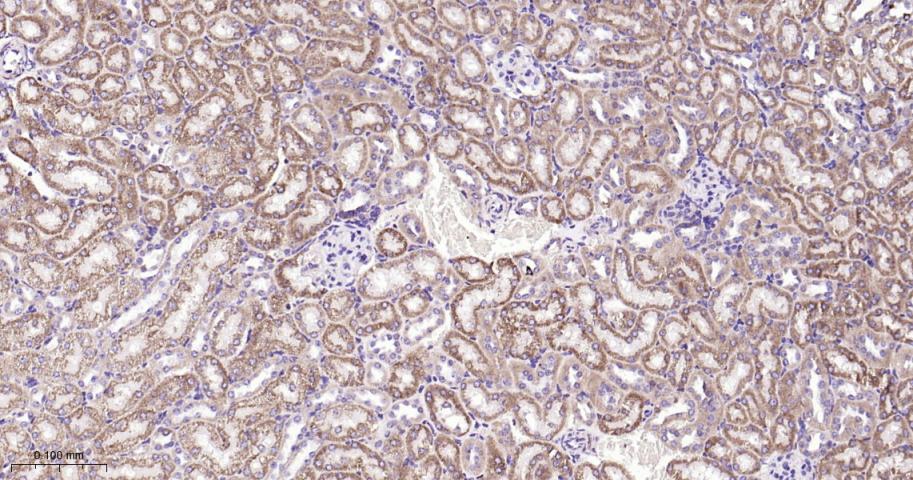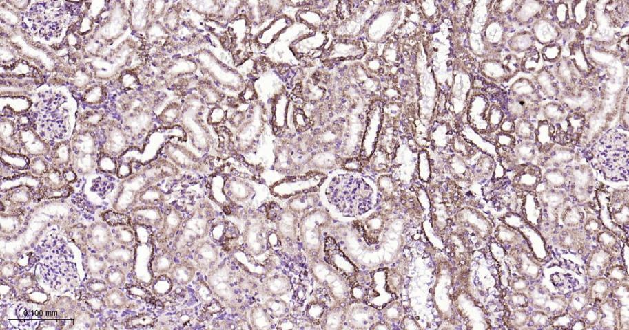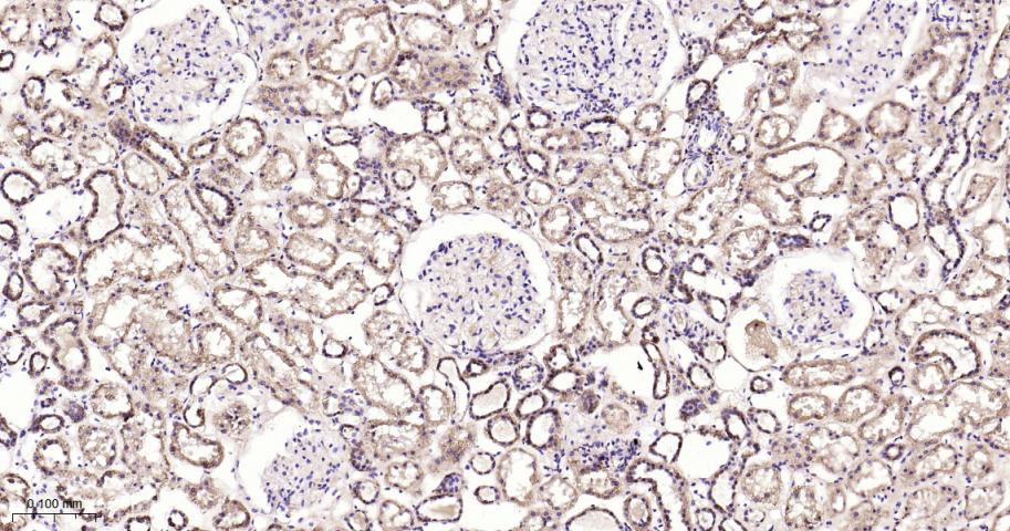 Paraformaldehyde-fixed, paraffin embedded Mouse Kidney; Antigen retrieval by boiling in sodium citrate buffer (pH6.0) for 15 min; Antibody incubation with HSPE1 Monoclonal Antibody, Unconjugated(bsm-60471R) at 1:200 overnight at 4°C, followed by conjugation to the bs-0295G-HRP and DAB (C-0010) staining.