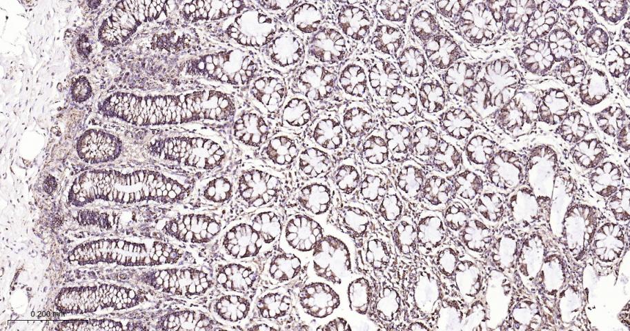 Paraformaldehyde-fixed, paraffin embedded Rat Colon; Antigen retrieval by boiling in sodium citrate buffer (pH6.0) for 15 min; Antibody incubation with HSPE1 Monoclonal Antibody, Unconjugated(bsm-60471R) at 1:200 overnight at 4°C, followed by conjugation to the bs-0295G-HRP and DAB (C-0010) staining.