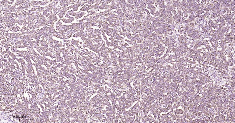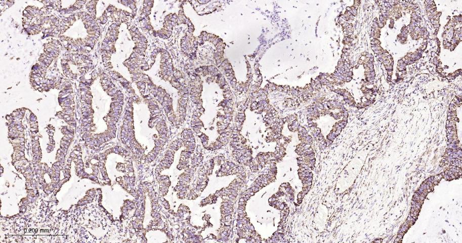 Paraformaldehyde-fixed, paraffin embedded Human Ovarian Cancer; Antigen retrieval by boiling in sodium citrate buffer (pH6.0) for 15 min; Antibody incubation with HSPE1 Monoclonal Antibody, Unconjugated(bsm-60471R) at 1:200 overnight at 4°C, followed by conjugation to the bs-0295G-HRP and DAB (C-0010) staining.