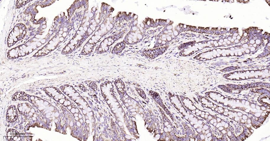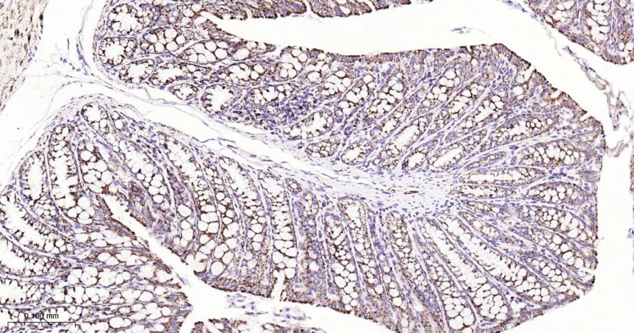 Paraformaldehyde-fixed, paraffin embedded Mouse Colon; Antigen retrieval by boiling in sodium citrate buffer (pH6.0) for 15 min; Antibody incubation with HSPE1 Monoclonal Antibody, Unconjugated(bsm-60471R) at 1:200 overnight at 4°C, followed by conjugation to the bs-0295G-HRP and DAB (C-0010) staining.