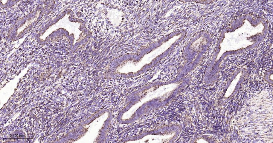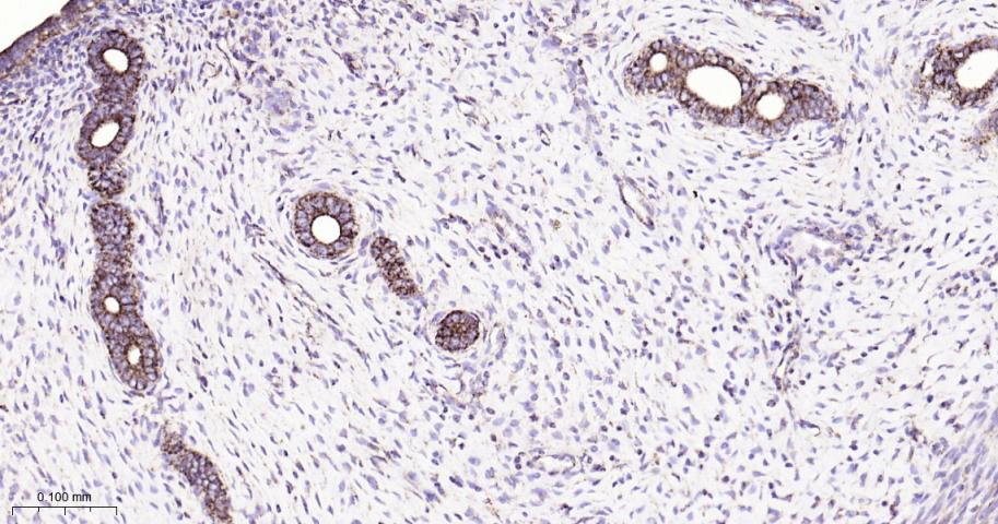 Paraformaldehyde-fixed, paraffin embedded Human Uterus; Antigen retrieval by boiling in sodium citrate buffer (pH6.0) for 15 min; Antibody incubation with HSPE1 Monoclonal Antibody, Unconjugated(bsm-60471R) at 1:200 overnight at 4°C, followed by conjugation to the bs-0295G-HRP and DAB (C-0010) staining.