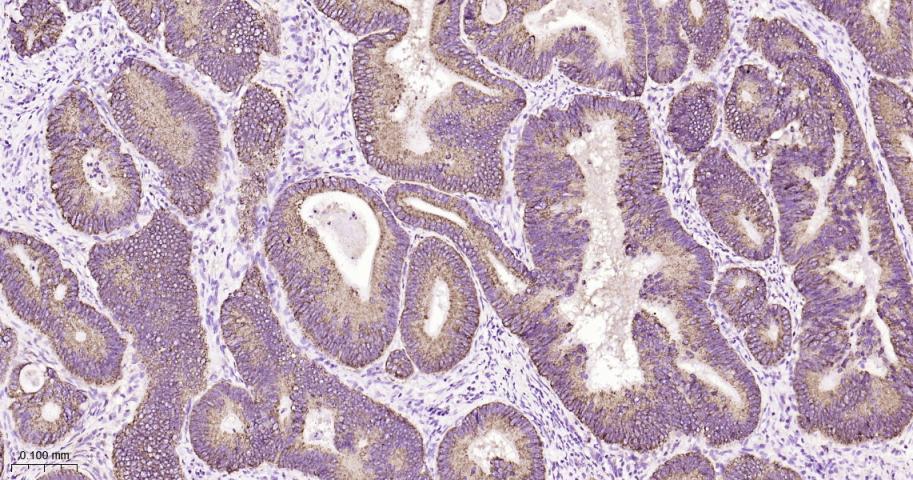 Paraformaldehyde-fixed, paraffin embedded Human Colon Cancer; Antigen retrieval by boiling in sodium citrate buffer (pH6.0) for 15 min; Antibody incubation with HSPE1 Monoclonal Antibody, Unconjugated(bsm-60471R) at 1:200 overnight at 4°C, followed by conjugation to the bs-0295G-HRP and DAB (C-0010) staining.