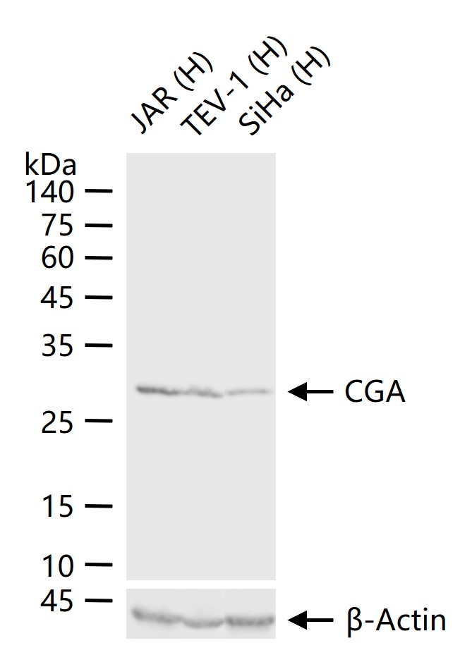 25 ug total protein per lane of various lysates (see on figure) probed with CGA monoclonal antibody, unconjugated (bsm-60623R) at 1:1000 dilution and 4°C overnight incubation. Followed by conjugated secondary antibody incubation at r.t. for 60 min.
