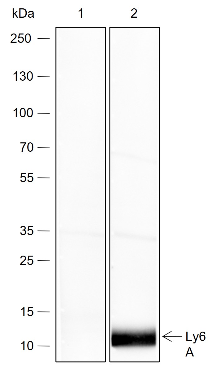 Lysate: 1: C2C12 cell lysate, the Ly6A Rabbit mAb pre-adsorbed with 3μM of the synthetic peptides; 2: C2C12 cell lysate, the Ly6A Rabbit mAb with no peptide blocking.
