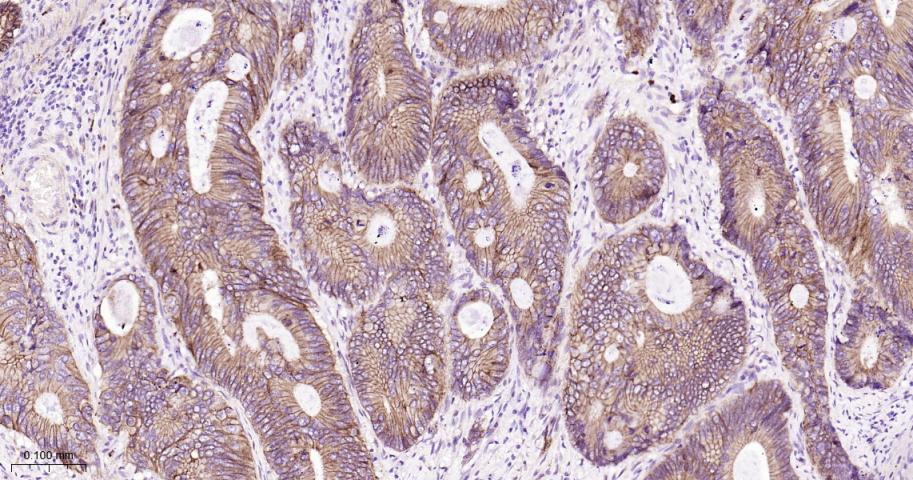 Paraformaldehyde-fixed, paraffin embedded Human Colon Cancer; Antigen retrieval by boiling in sodium citrate buffer (pH6.0) for 15 min; Antibody incubation with CTNND1 Monoclonal Antibody, Unconjugated(bsm-60229R) at 1:200 overnight at 4°C, followed by conjugation to the bs-0295G-HRP and DAB (C-0010) staining.