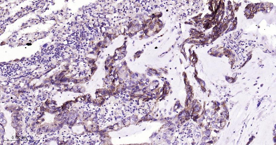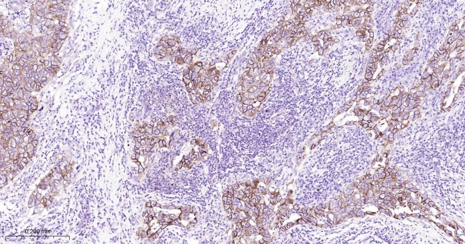 Paraformaldehyde-fixed, paraffin embedded Human Lung Cancer; Antigen retrieval by boiling in sodium citrate buffer (pH6.0) for 15 min; Antibody incubation with CTNND1 Monoclonal Antibody, Unconjugated(bsm-60229R) at 1:200 overnight at 4°C, followed by conjugation to the bs-0295G-HRP and DAB (C-0010) staining.