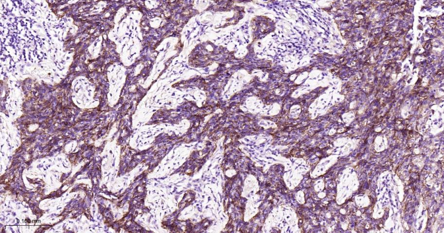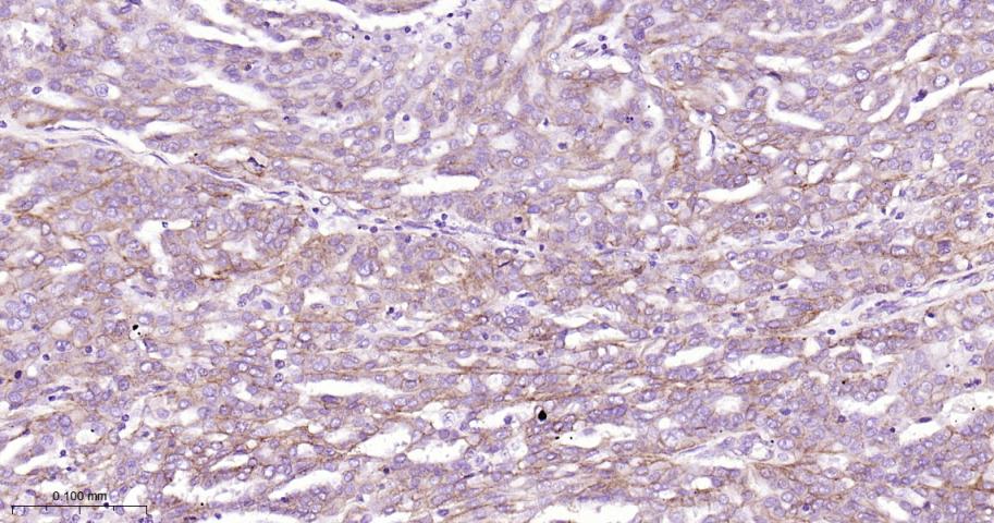 Paraformaldehyde-fixed, paraffin embedded Human Ovarian Cancer; Antigen retrieval by boiling in sodium citrate buffer (pH6.0) for 15 min; Antibody incubation with CTNND1 Monoclonal Antibody, Unconjugated(bsm-60229R) at 1:200 overnight at 4°C, followed by conjugation to the bs-0295G-HRP and DAB (C-0010) staining.