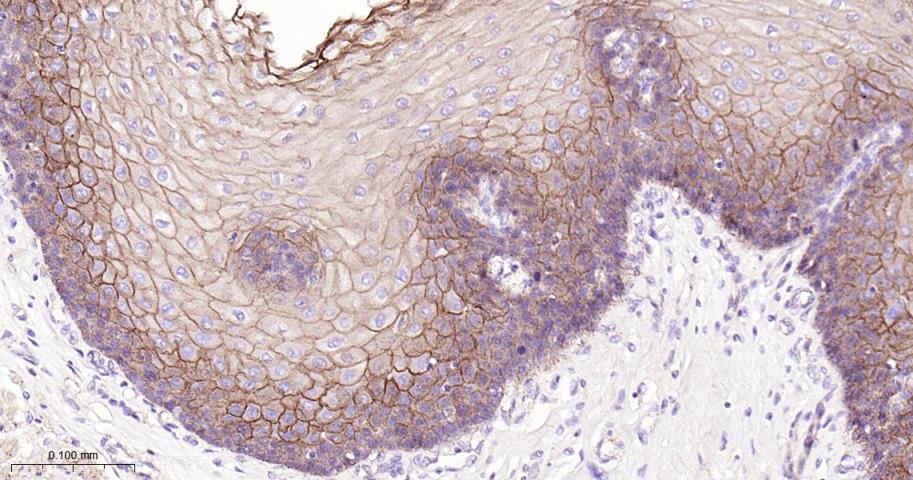 Paraformaldehyde-fixed, paraffin embedded Human Esophagus; Antigen retrieval by boiling in sodium citrate buffer (pH6.0) for 15 min; Antibody incubation with CTNND1 Monoclonal Antibody, Unconjugated(bsm-60229R) at 1:200 overnight at 4°C, followed by conjugation to the bs-0295G-HRP and DAB (C-0010) staining.