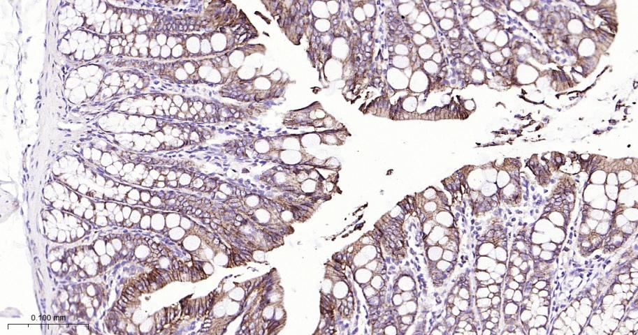 Paraformaldehyde-fixed, paraffin embedded Mouse Colon; Antigen retrieval by boiling in sodium citrate buffer (pH6.0) for 15 min; Antibody incubation with CTNND1 Monoclonal Antibody, Unconjugated(bsm-60229R) at 1:200 overnight at 4°C, followed by conjugation to the bs-0295G-HRP and DAB (C-0010) staining.