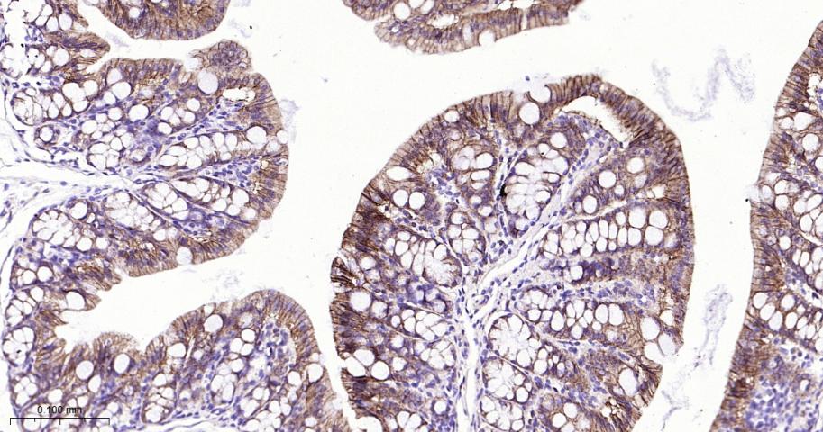Paraformaldehyde-fixed, paraffin embedded Rat Colon; Antigen retrieval by boiling in sodium citrate buffer (pH6.0) for 15 min; Antibody incubation with CTNND1 Monoclonal Antibody, Unconjugated(bsm-60229R) at 1:200 overnight at 4°C, followed by conjugation to the bs-0295G-HRP and DAB (C-0010) staining.