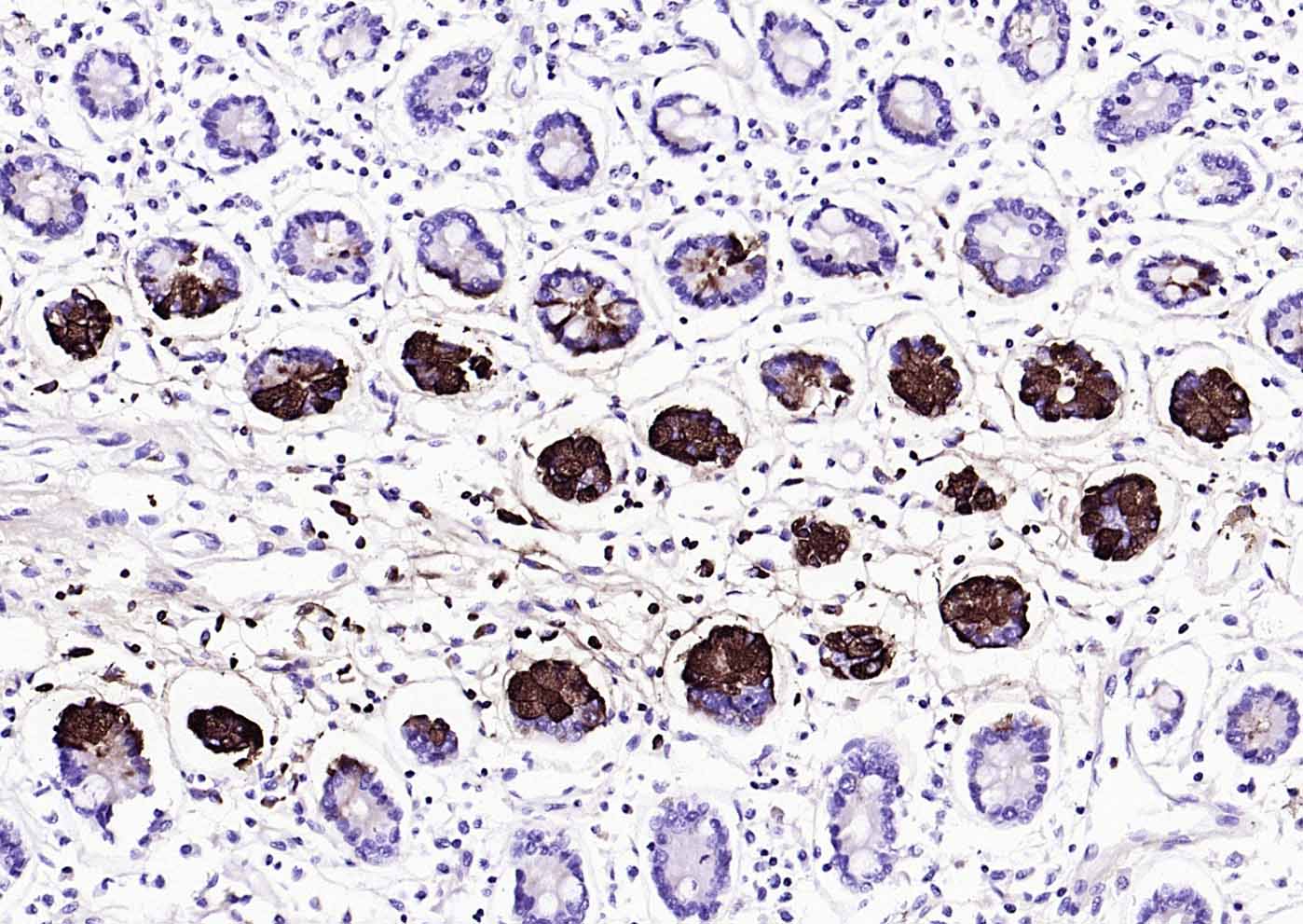 Paraformaldehyde-fixed, paraffin embedded (Human duodenum); Antigen retrieval by boiling in sodium citrate buffer (pH6.0) for 15min; Block endogenous peroxidase by 3% hydrogen peroxide for 20 minutes; Blocking buffer (normal goat serum) at 37°C for 30min; Incubation with (Lysozyme) Monoclonal Antibody, Unconjugated (bsm-60643R) at 1:200 overnight at 4°C, followed by operating according to SP Kit(Rabbit) (sp-0023) instructionsand DAB staining.