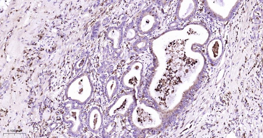 Paraformaldehyde-fixed, paraffin embedded Human Pancreatic Cancer; Antigen retrieval by boiling in sodium citrate buffer (pH6.0) for 15 min; Antibody incubation with Lysozyme Monoclonal Antibody, Unconjugated(bsm-60643R) at 1:200 overnight at 4°C, followed by conjugation to the bs-0295G-HRP and DAB (C-0010) staining.