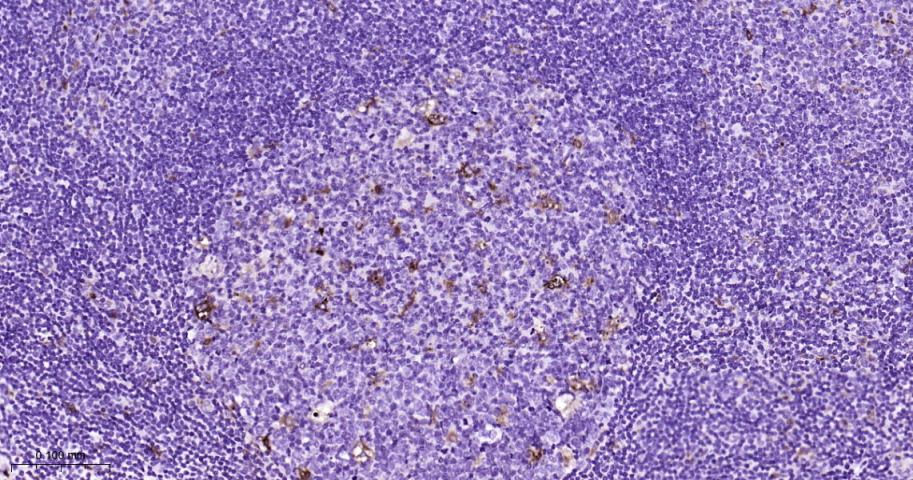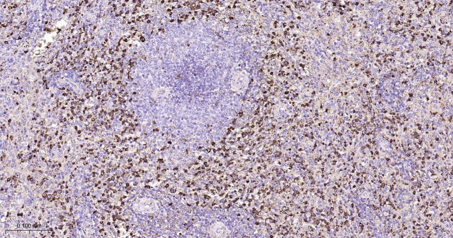 Paraformaldehyde-fixed, paraffin embedded Mouse Spleen; Antigen retrieval by boiling in sodium citrate buffer (pH6.0) for 15 min; Antibody incubation with Lysozyme Monoclonal Antibody, Unconjugated(bsm-60643R) at 1:200 overnight at 4°C, followed by conjugation to the bs-0295G-HRP and DAB (C-0010) staining.