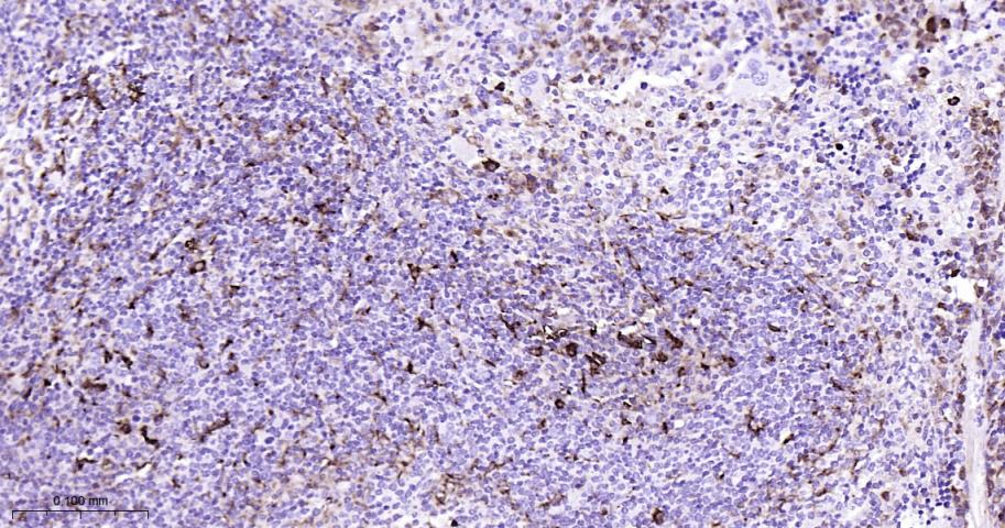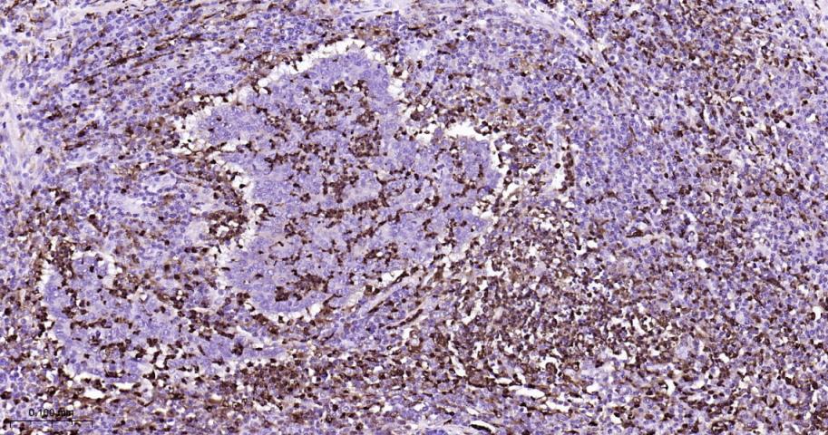 Paraformaldehyde-fixed, paraffin embedded Human Spleen; Antigen retrieval by boiling in sodium citrate buffer (pH6.0) for 15 min; Antibody incubation with Lysozyme Monoclonal Antibody, Unconjugated(bsm-60643R) at 1:200 overnight at 4°C, followed by conjugation to the bs-0295G-HRP and DAB (C-0010) staining.