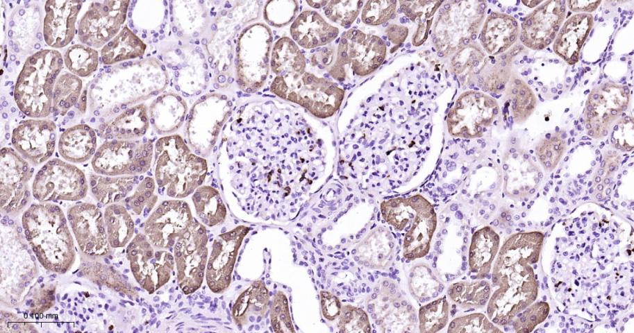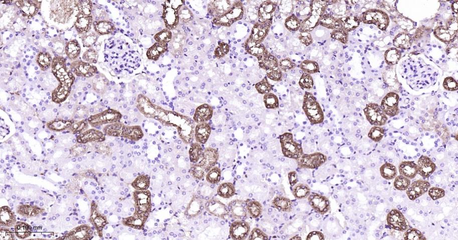 Paraformaldehyde-fixed, paraffin embedded Mouse Kidney; Antigen retrieval by boiling in sodium citrate buffer (pH6.0) for 15 min; Antibody incubation with Lysozyme Monoclonal Antibody, Unconjugated(bsm-60643R) at 1:200 overnight at 4°C, followed by conjugation to the bs-0295G-HRP and DAB (C-0010) staining.